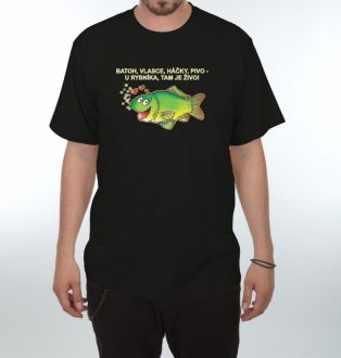 Tričko s obrázkem a nápisem - Batoh, vlasce, háčky, pivo - u rybníka, tam je živo! Dodací lhůta 7 dní. U rybníka je vždycky živo, hlavně v okolí vašeho háčku a podběráku. Už jste si zvykli na závistivé pohledy ostatních? Dárek ro rybáře.