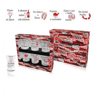 Chtěli byste mít takové panáky, které nikdo z Vašich přátel nemá? Pořiďte si panáky, které na sobě mají potisk v podobě nápisů s obrázkem, určitě s nimi pobavíte všechny známé. A na jaké nápisy se můžete těšit? Např. Na Zdraví a Štěstí, Pijem ať žijem, Nejsme u suchánků atd. Panáky můžete pořídit i kamarádovi, pokud se k němu chystáte třeba na párty, oslavu narozenin nebo večírek. Balení obsahuje 6 kusů panáků, každý panák má svůj originální nápis, ani jeden se neopakuje. Rozměry balení: 28 x 4,5 x 7,5 cm, panák: průměr přibližně 3,8 cm, výška přibližně 7 cm. Panáky jsou skleněné. Objem panáků: cca 0,02 dcl. Pozor! Nevhodné do myčky nádobí, panáky jsou určeny k ručnímu mytí.