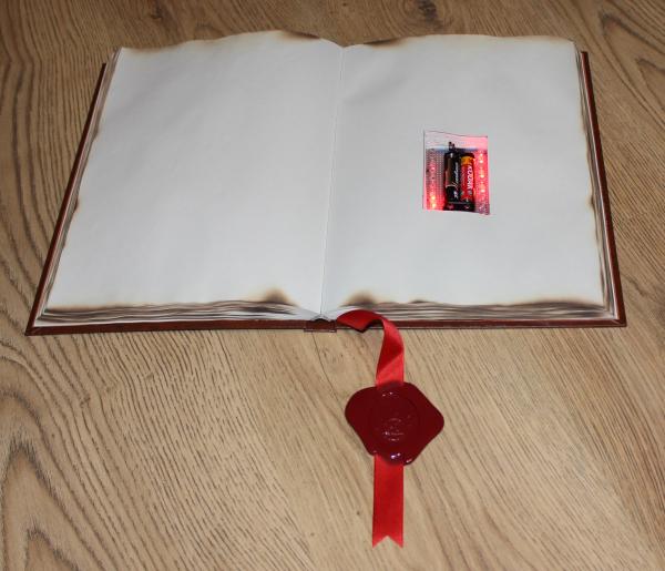 - Součástí knihy je stuha s velkou pečetí s pekelným motivem.