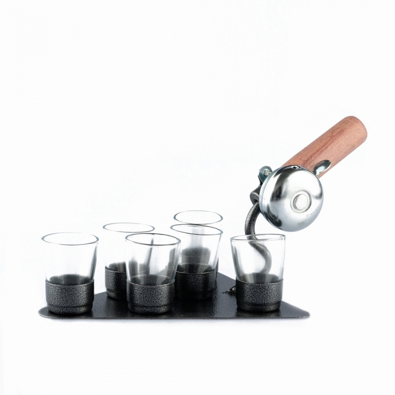 Zednická lžíce z nerezu s šesti otvory a místem pro láhev alkoholu, do kterých krásně pasují štamprdlátka. Součástí je zvonek . Dodáváme komplet s panákama. Pro roznášku kořalky na různých oslavách, narozeninách, silvestru atd... Máte známého zedníka, překvapte ho tímto stylovým dárkem.