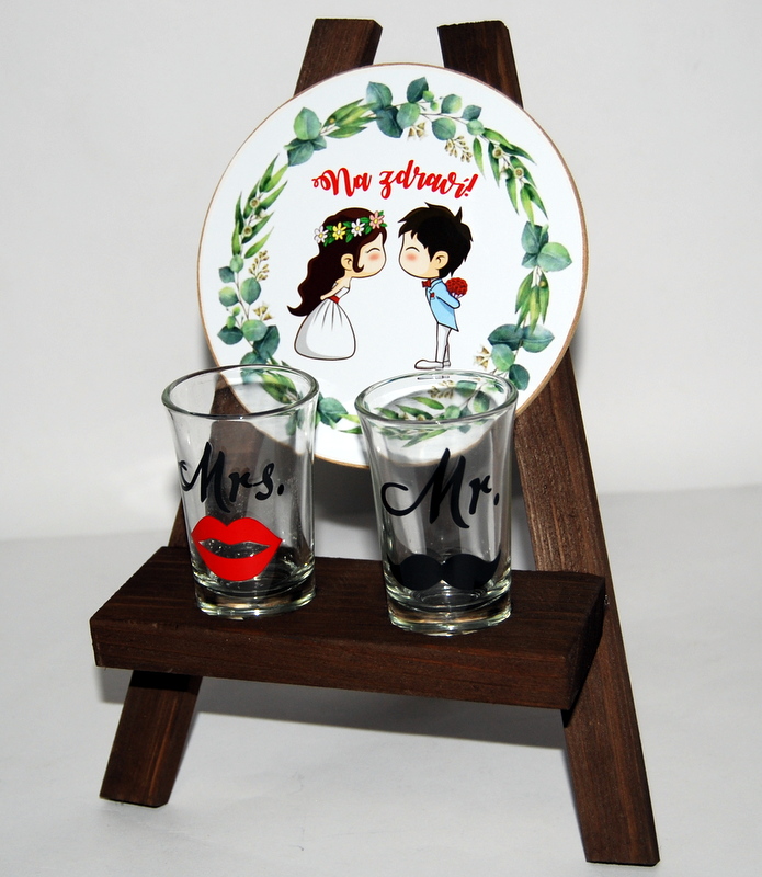 Dřevěný stojan a dvě skleničky na alkohol. Průměr obrázku 12cm. Výška 22cm. Skleničky na alkohol: 2 ks, objem 0,05 cl Dřevěný stojan s originálním potiskem je skvělý stojánek na dva panáky na alkohol. Skleničky jsou součástí balení. Připijte si se svým protějškem na zdraví!