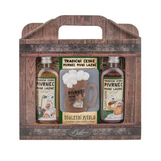 Dárkové balení pivní kosmetiky Pivrnec - sprchový gel 100 ml + ručně vyráběné mýdlo (půllitr) + vlasový šampon 100 ml Pivní sprchový gel s extrakty z pivních kvasnic a chmele. Nová receptura využívá po vzoru moderních pivních koupelí příznivých účinků pivních kvasnic na pokožku. Samotné extrakty z pivních kvasnic (Saccharomyces Cerevisiae) a chmelu obecného (Humulus Lupulus) mají popsány hydratační, antiseptické a mnoho jiných účinků. Do receptury přináší proteiny, lipoidy, vitamíny a další vlasu a pokožce prospěšné látky. Kvalitní mycí a ošetřující složky, vyvážené pH a účinná kombinace extraktů zaručují dokonalé a šetrné mytí při zachování přirozeného ochranného filmu a vlhkosti pokožky. Pivní krémové ručně vyráběné toaletní mýdlo s glycerinem a extrakty z pivních kvasnic a chmele - půllitr. Jemné toaletní mýdlo s glycerinem a extrakty z pivních kvasnic (Saccharomyces Cerevisiae) a chmelu obecného (Humulus Lupulus). Myje šetrně a účinně pokožku celého těla bez jejího nadměrného