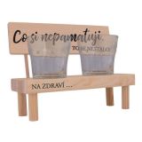- Dřevěná lavička s originálním potiskem je skvělý stojánek na dva panáky na alkohol.