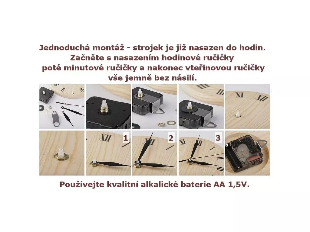 - Hodinový strojek - 3 hodinové ručičky (130 mm, 96 mm, 67 mm), strojek, šroubek s matičkou a závěsem.