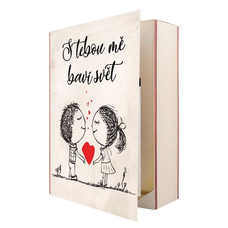 Dárkový balíček s kosmetikou pro muže nebo ženu, který na první pohled vypadá jako kniha ke čtení s názvem "S tebou mě baví svět." .