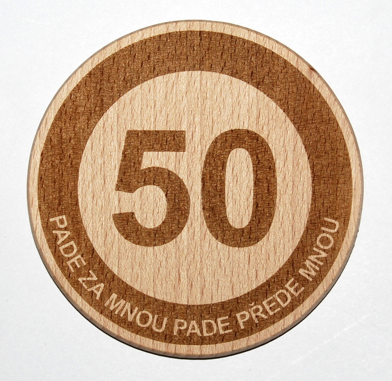 - Na podtácku je číslo 50 a nápis: "Pade za mnou pade přede mnou."