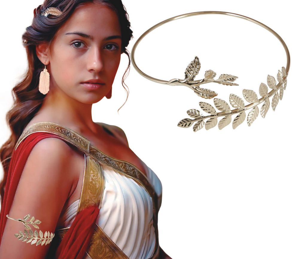 • Kovový náramek s vavřínovým listem zlatý, nezbytný doplněk pro všechny bohy či bohyně.