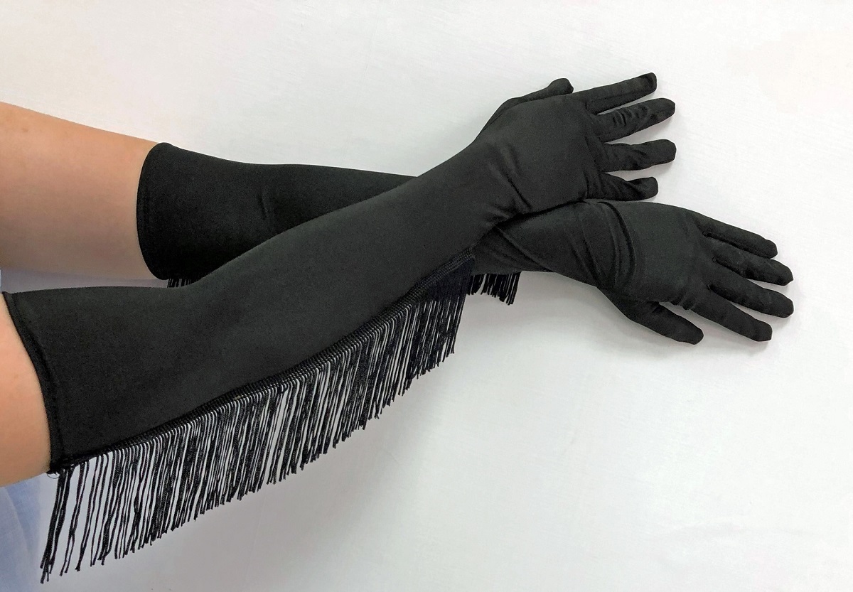 Černé saténové rukavice s třásněmi - 55 cm